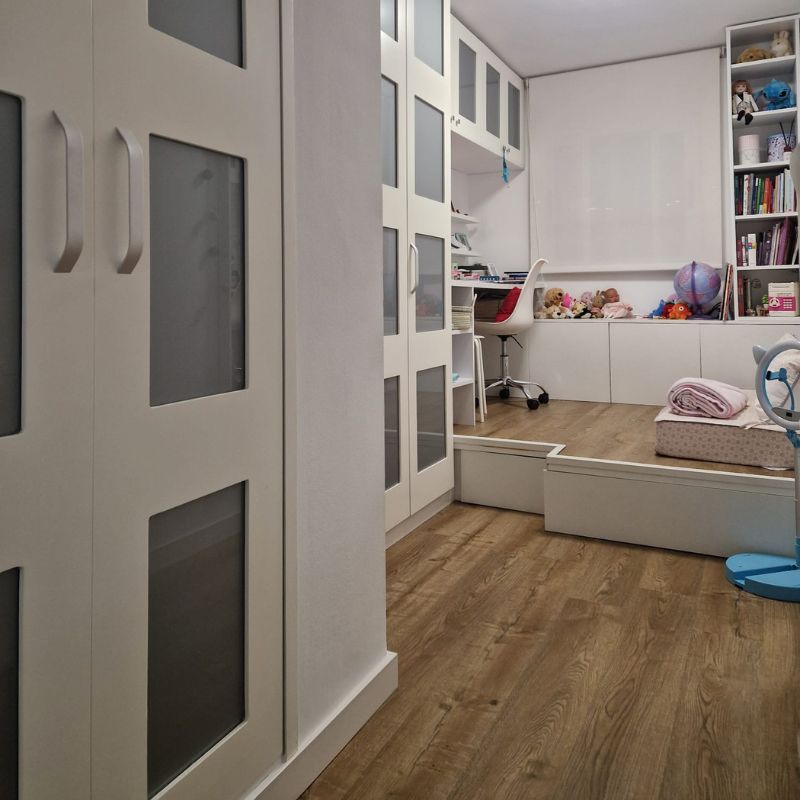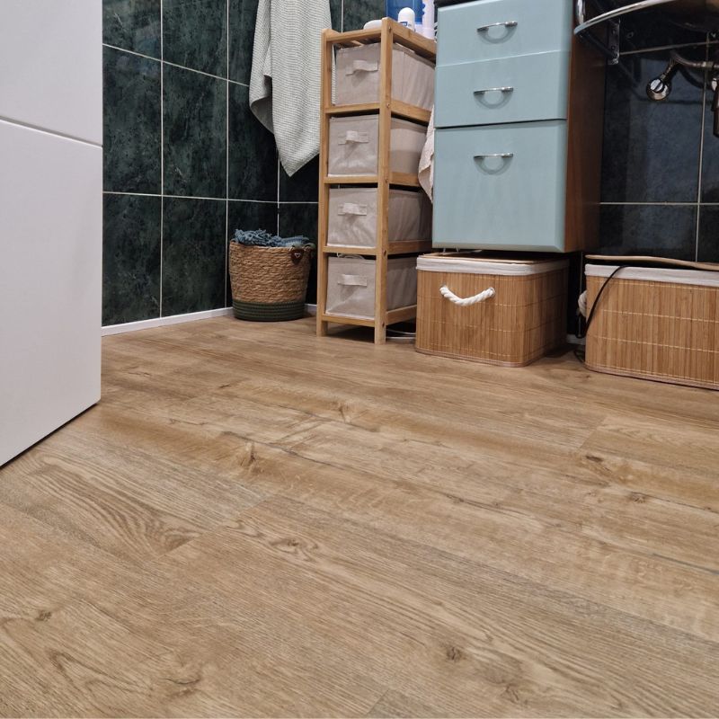 Para cumplir con estos requisitos, se optó por instalar un pavimento SPC Hausâl Estándar en color roble montaña en toda la vivienda. Esta solución destaca por su alta resistencia al desgaste y al agua, lo que lo convierte en una solución ideal para hogares con uso intenso, garantizando estabilidad y durabilidad en todas las zonas de la casa, cocina y baños inclusive.